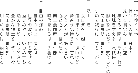 一、行動こそ時代を先駆けるべき青年の責務と信じ 力を合わせ 国の礎となろう